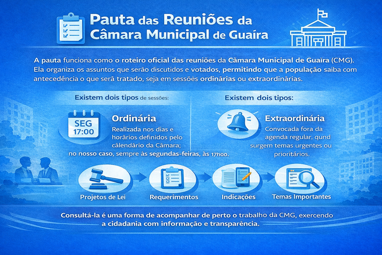 Consultar essa pauta permite que a população acompanhe como as propostas que estão sendo avaliadas, garantindo transparência, organização e participação cidadã em cada etapa do processo legislativo da Câmara Municipal de Guaíra (CMG).